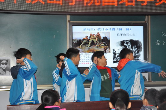 周老师根据教学内容设计了三个活动,一是张学良生平事迹展;二是分组讲解百团大战和平型关大捷;三是排演话剧《狼牙山五壮士》、《抗联英雄杨靖宇》、《少年英雄王二小》。