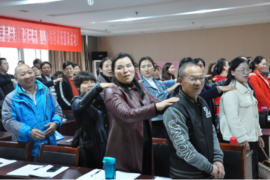 这是贺光辉老师“小学思品课教学组织的新形式”课程开始之前的暖场游戏。游戏之后,他向学员展示了对平顶山地区共50所城市和乡村小学的思想品德课教学现状的调研结果,揭示了小学思品教师兼职居多,而专职教师匮乏及教学积极性偏低的尴尬处境。随后,贺老师引导学员们牢记我国立德树人的根本教育任务,在思想品德课内容与形式并重的情况下进一步丰富教学内容和创新教育方式。最后,贺老师给大家示范游戏化学习在小学思品教学中的应用,将拍手舞、捏捏肩、捶捶背这些小游戏穿插在课堂培训中,使学员们在轻松愉悦的氛围中收获良多。