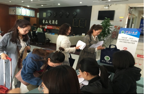 上午9:00左右,学员陆续开始报到。接待处工作人员热情地迎接参加此次国培的老师,为他们提供周到的服务,从学员的信息登记、作业收缴、资料发放到住宿安排等环节,整个工作井然有序。